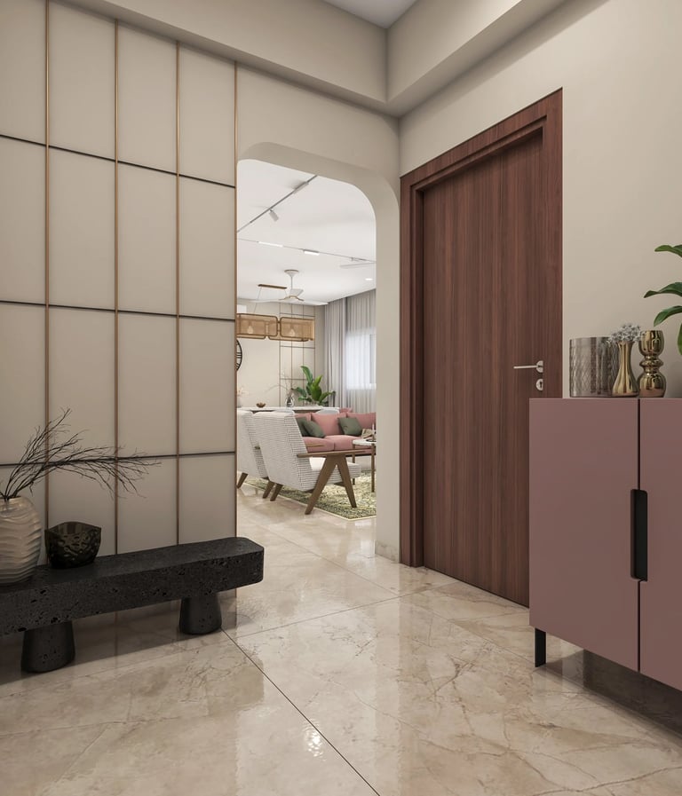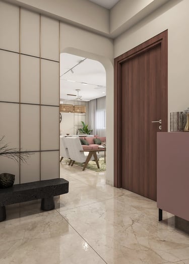 The interiors feature a minimalist yet elegant aesthetic, characterized by subtle pastel highlights that emphasize simplicity and practicality. This design approach prioritizes easy maintenance, resulting in a functional and uncluttered living space.