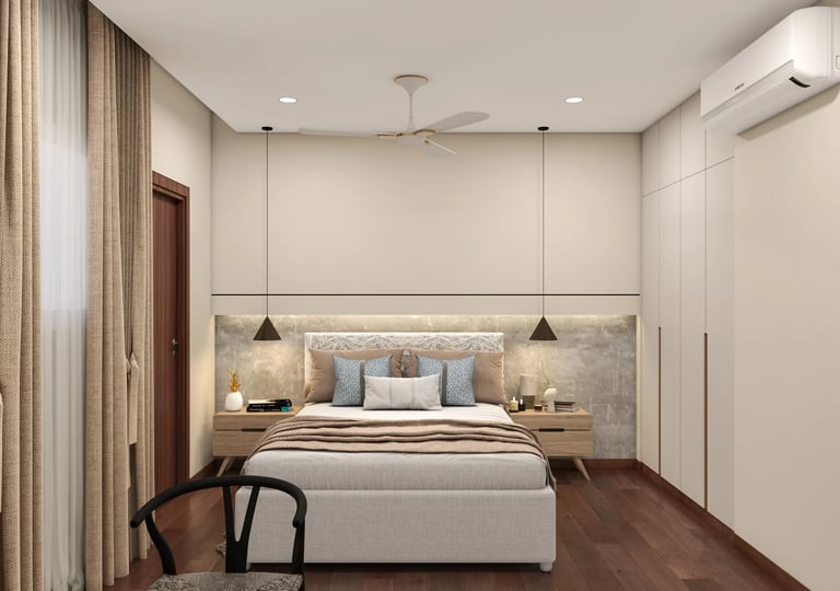 The furniture, with its light finishes and clean lines, reflects a modern aesthetic, creating a sleek and uncluttered ambiance